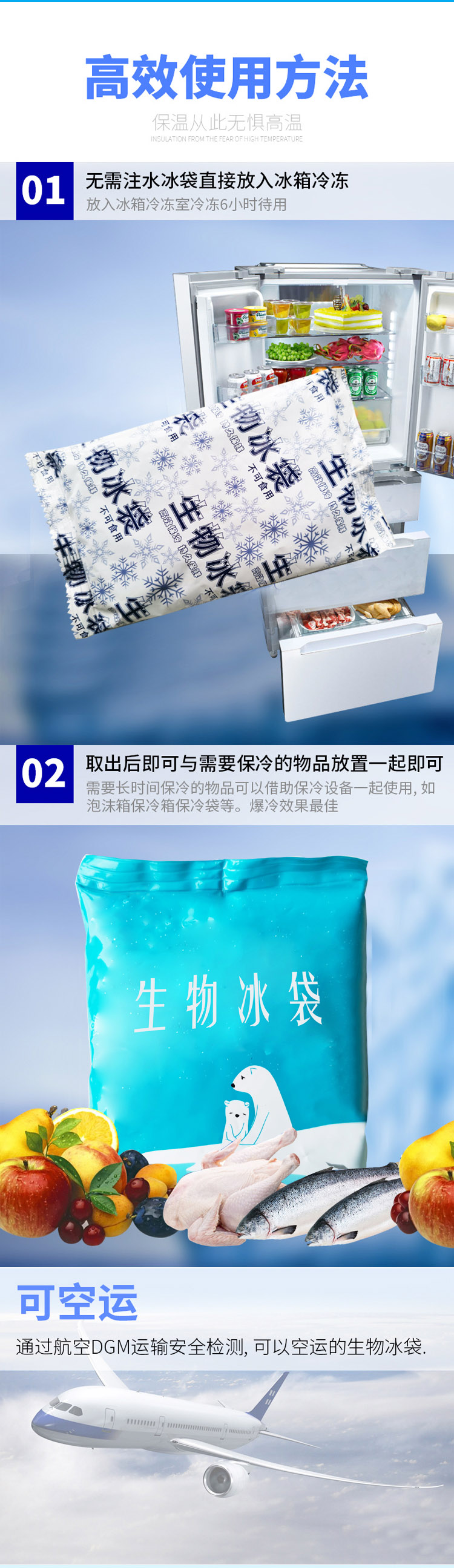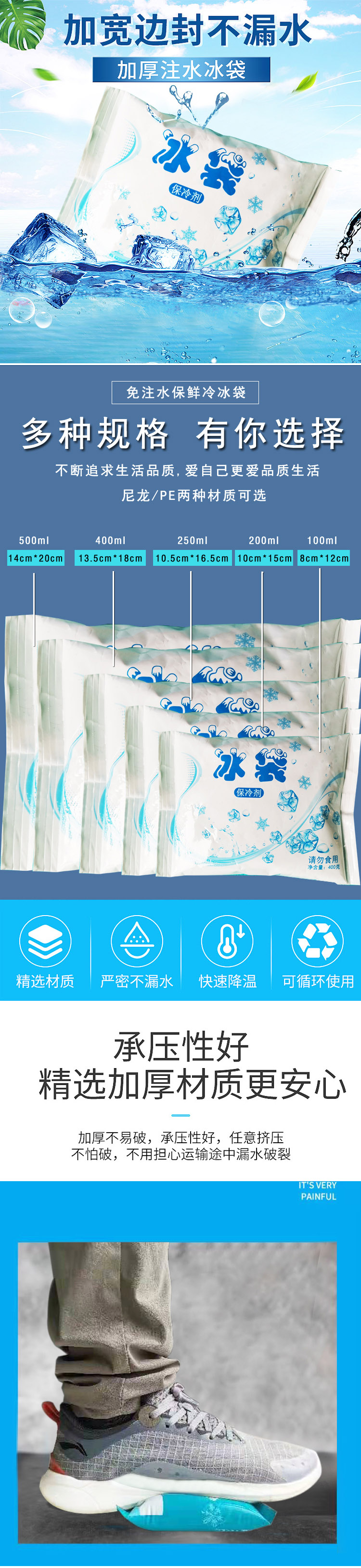 規(guī)格:100克、200克、250克、300克、400克、500克材質(zhì):PE+PET/尼龍溫控范圍:0℃,-5℃,-10℃,一20℃,5℃,10℃,20℃等使用方法:將本品放入冷凍室(-18℃)充分蓄冷12小時(shí)以后,根據(jù)需要直接作為冷凍介質(zhì)使用