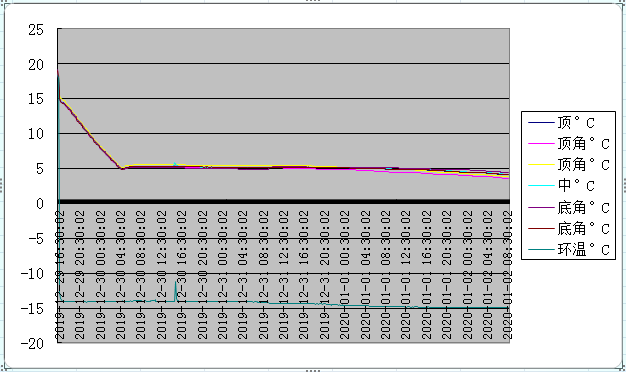 在模擬夏季高溫下,冷鏈運(yùn)輸箱中,空載的測(cè)試專用箱里,測(cè)試為73小時(shí)30分鐘。
