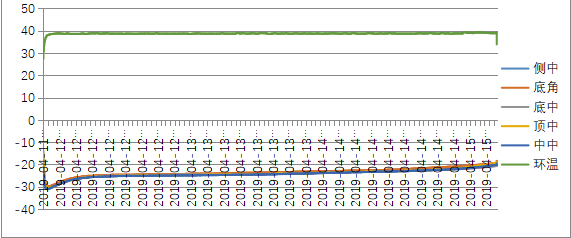在模擬夏季低溫下,冷鏈運(yùn)輸箱中,空載的測(cè)試專用箱里,測(cè)試為73小時(shí)30分鐘。