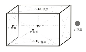 依據(jù)本保溫箱驗(yàn)證方案,本次檢測(cè)共布溫度測(cè)量點(diǎn)5處,1處環(huán)境測(cè)點(diǎn)具體布點(diǎn)方式 如下圖: